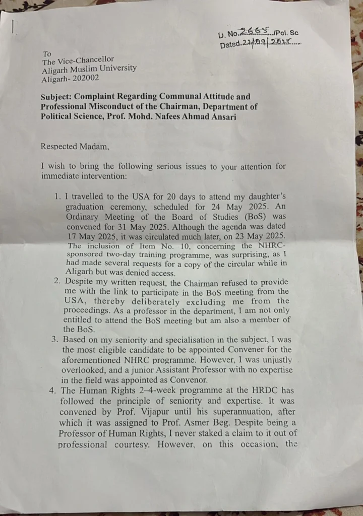 साथ ही 2024 में ट्रेनिंग वर्कशॉप मुझे ना देकर एक असिस्टेंट प्रोफेसर को दे दी गई. मैंने जब उस पर विरोध जताया और जिसके बाद वह मुझे दी गई. अगले साल वह चुपचाप मुझसे काफी जूनियर एक एसोसिएट प्रोफेसर डॉ. नगमा फारूकी को दे दी गई.