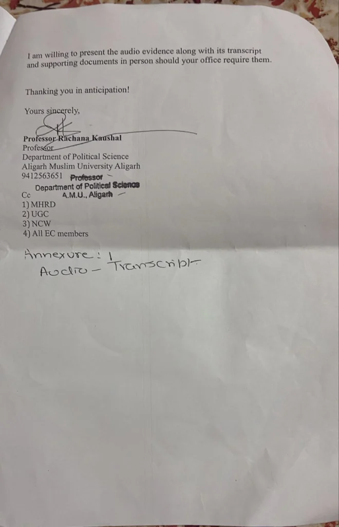 रचना कौशल – सितंबर 2025 की शुरुआत में मेरे पास डीन इकराम हुसैन से एक लेटर आया. जिसमें एमए की किसी स्टूडेंट की शिकायत के आधार पर मुझ से सफाई मांगी गई थी. जिस शिकायत में लिखा था कि मैं क्लास में गलत भाषा का प्रयोग करती हूं, क्लास में दहशत का माहौल बनाती हूं और निजी कमेंट पास करती हूं.