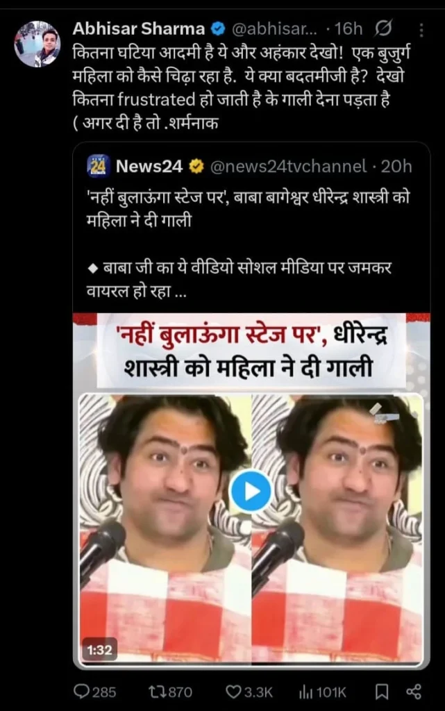 Last month, News24 shared an edited video clip of a conversation between Bageshwar Dham Sarkar Sri Dhirendra Krishna Shastri and an old woman on its X social media handle. The text written on the clip was: ‘Nahi bulaaunga stage par,’ Dhirendra Shastri ko mahila ne di gaali (‘I won’t call you on stage,’ the woman hurled abuse at Dhirendra Shastri).