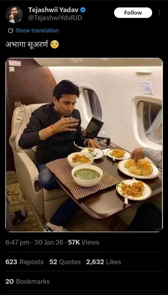 In another instance, in January 2026, a parody account of Tejashwi Yadav, Chief of Rashtriya Janata Dal (RJD), who describes himself as a small soldier of the party, wrote: ‘अभागा सूअरर्ण’ – Unfortunate Suwarna. Yadav wrote this as a caption of a pic featuring the popular poet Kumar Vishwas. In the image, Vishwas was simply having food while sitting in an airplane. But he was compared to a ‘pig’, just because he belongs to the ‘upper caste’.