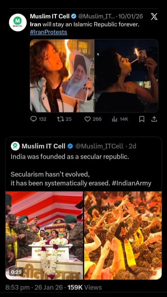 The most ironic example was of two tweets from an account named ‘Muslim IT Cell’. In one, the Cell wrote: ‘Iran will stay an Islamic Republic forever’, including two images from the brave ongoing unrest in Iran. In the other, a few Indian Army officers had gone to meet Sri Shastri, and their only fault was that they could be seen immersed in spirituality, and the same Cell wrote: ‘India was founded as a secular republic. Secularism hasn’t evolved; it has been systematically erased. #Indian Army’. When this is also nothing, but a farce.