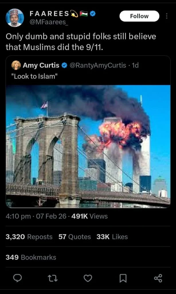 I use X occasionally. On 7 February, when I opened my X account, I saw a post from an account named Faarees. In his tweet, Faarees wrote: ‘Only dumb and stupid folks still believe that Muslims did the 9/11’.