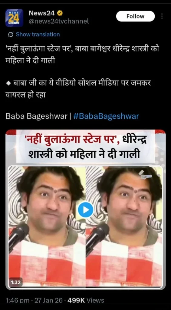 Last month, News 24 shared an edited video clip of a conversation between Bageshwar Dham Sarkar Sri Dhirendra Krishna Shastri and an old woman on its X social media handle. The text written on the clip was: ‘Nahi bulaaunga stage par,’ Dhirendra Shastri ko mahila ne di gaali (‘I won’t call you on stage,’ the woman hurled abuse at Dhirendra Shastri).